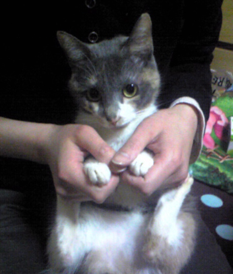 ネコちゃんとご対面。ネコちゃんはベスの部屋の付けっぱなしのホットカーペットの上で毛布にくるまりゲッソリと痩せこけ見る影もなかった。もうひと月近く水しか飲んでない状態だと聞いていた。その水さえあまり飲めない。普通に飲むと吐いてしまう。